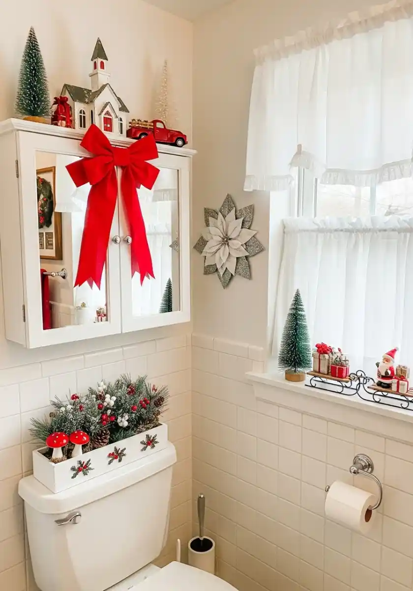 This room is cheerful like a carol. A medicine cabinet wears a giant red bow, and the top hosts a tiny church, a red truck, and mini trees. On the windowsill, a sleigh with Santa brings a little motion. The planter on the toilet tank mixes flocked greens, berries, and those whimsical mushrooms. It’s classic Christmas white bathroom decor, but playful.