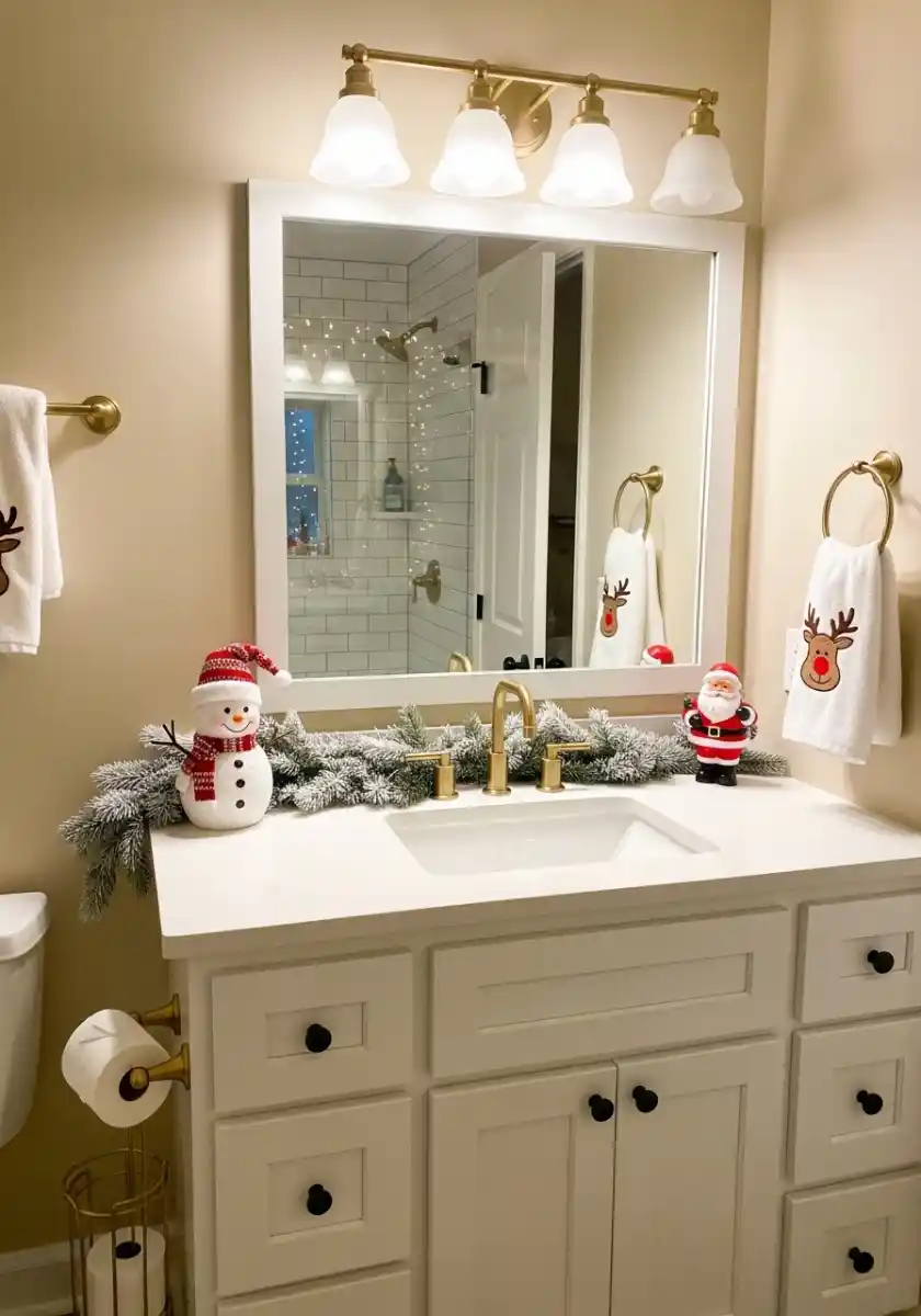 If you do this at home, give the figurines a tray so they behave. Swap your usual towels for tan or oatmeal with small snowman embroidery. That blends better than bright white against all the white surfaces. Put your garland on a timer so you’re not plugging and unplugging every night. It’s a maximal take on bathroom Christmas decor white, and it’s pure joy for kids and grandparents.