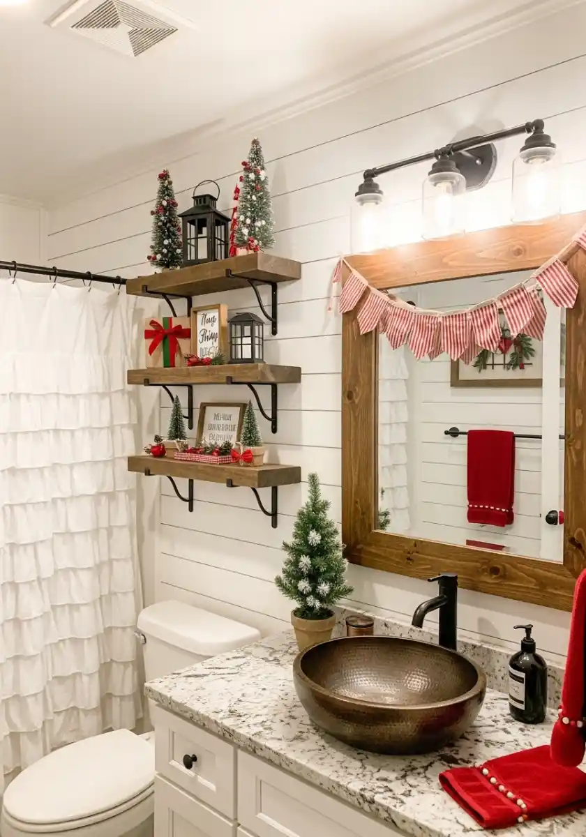 This look blends farmhouse with little market-stall moments. The wood shelves stack mini trees, black lanterns, and red ribbons. A striped bunting trims the mirror and a small tree stands by a hammered copper vessel sink. The ruffled shower curtain softens everything. It’s a lively white bathroom holiday decor plan that doesn’t need a big budget.