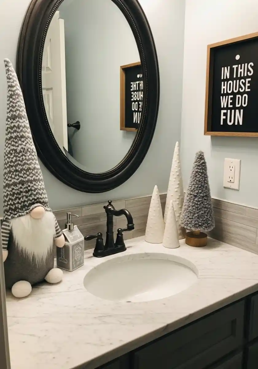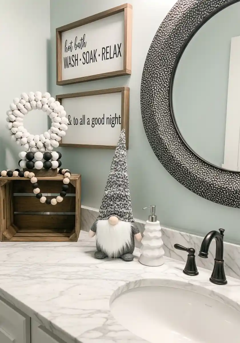 I tried a gnome at home and learned to keep everything else simple or he steals the show. Use one crate to lift the decor and coil the bead garland through it. If your mirror frame is dark, repeat that color once more with a black soap pump or tray. With these repeats, the white Christmas bath decor feels designed, not random, and you can keep it out till February.