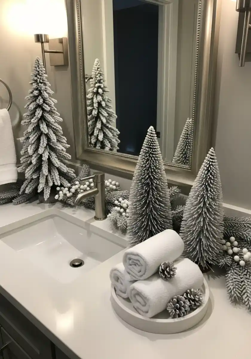 Nothing shouts festive and neat like a lineup of frosted bottle-brush trees. Against a clean counter and a silver-framed mirror, this mini forest turns reflections into double sparkle, which is smart for tiny rooms. Roll white hand towels and tuck a couple pinecones on a tray. It’s tidy hotel energy, and that’s why I love it. This is low-cost bathroom Christmas decor white that looks fancy.