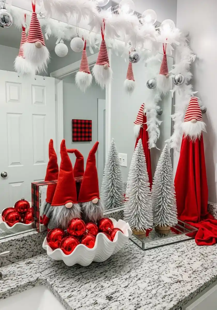 This one is fun and a little glam. A white feather boa trims the mirror like fluffy snow. Silver ornaments and peppermint-striped gnome hats hang at different heights. On the counter, a clamshell bowl holds shiny red balls and two gnomes lean in like they’re gossiping. Silvery bottle-brush trees and a bold red towel finish it. It’s spirited bathroom Christmas decor white with a playful wink.
