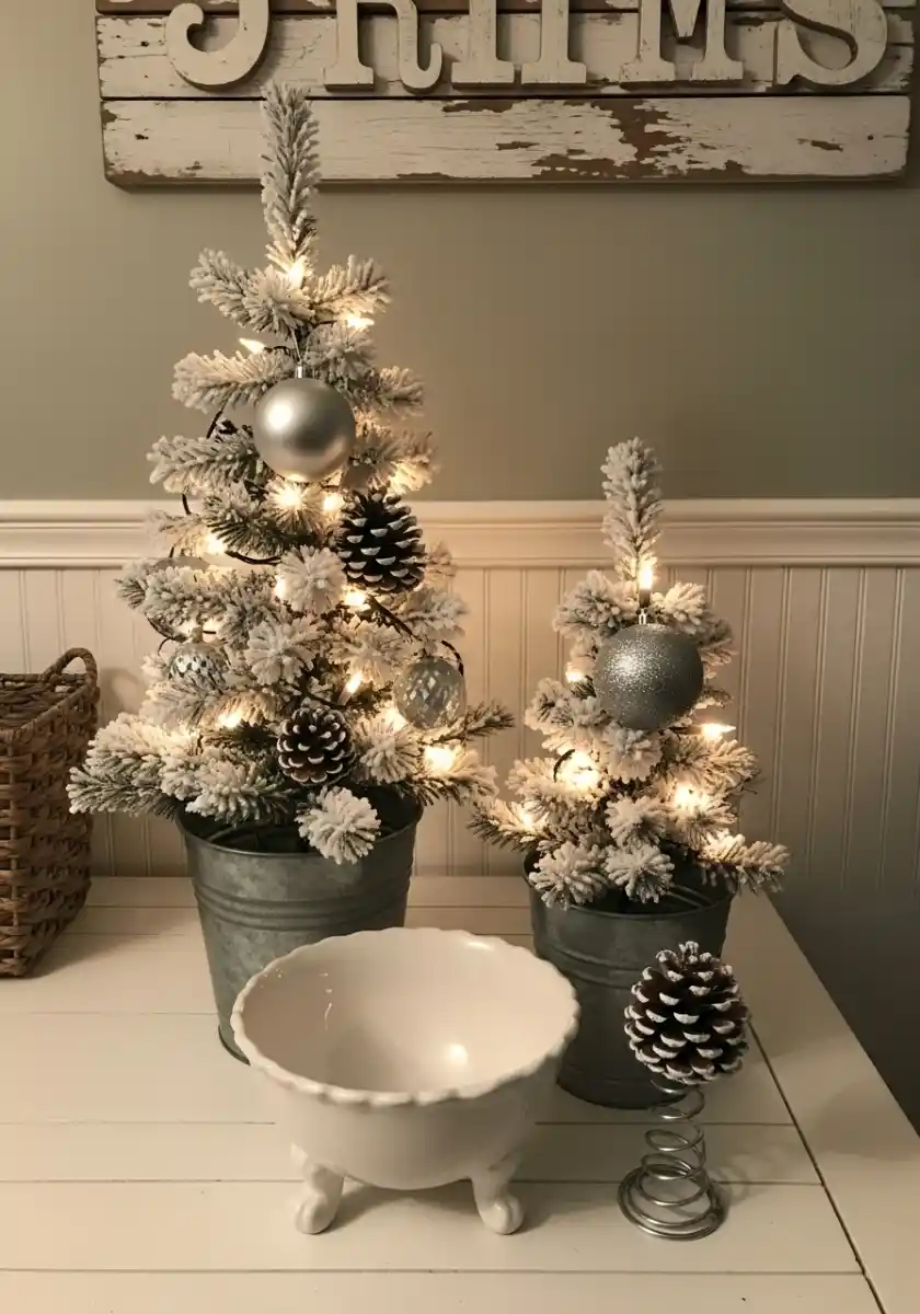 Two flocked tabletop trees in galvanized buckets feel like a tiny winter forest. The silver ornaments and snowy pinecones keep it cool and glowy, while the warm micro-lights stop the scene from feeling icy. I love the rustic metal paired with a white ceramic bowl. That contrast makes the white Christmas bathroom decor read extra crisp. If your shelf is shallow, these pencil-style trees are perfect because they don’t hog depth.