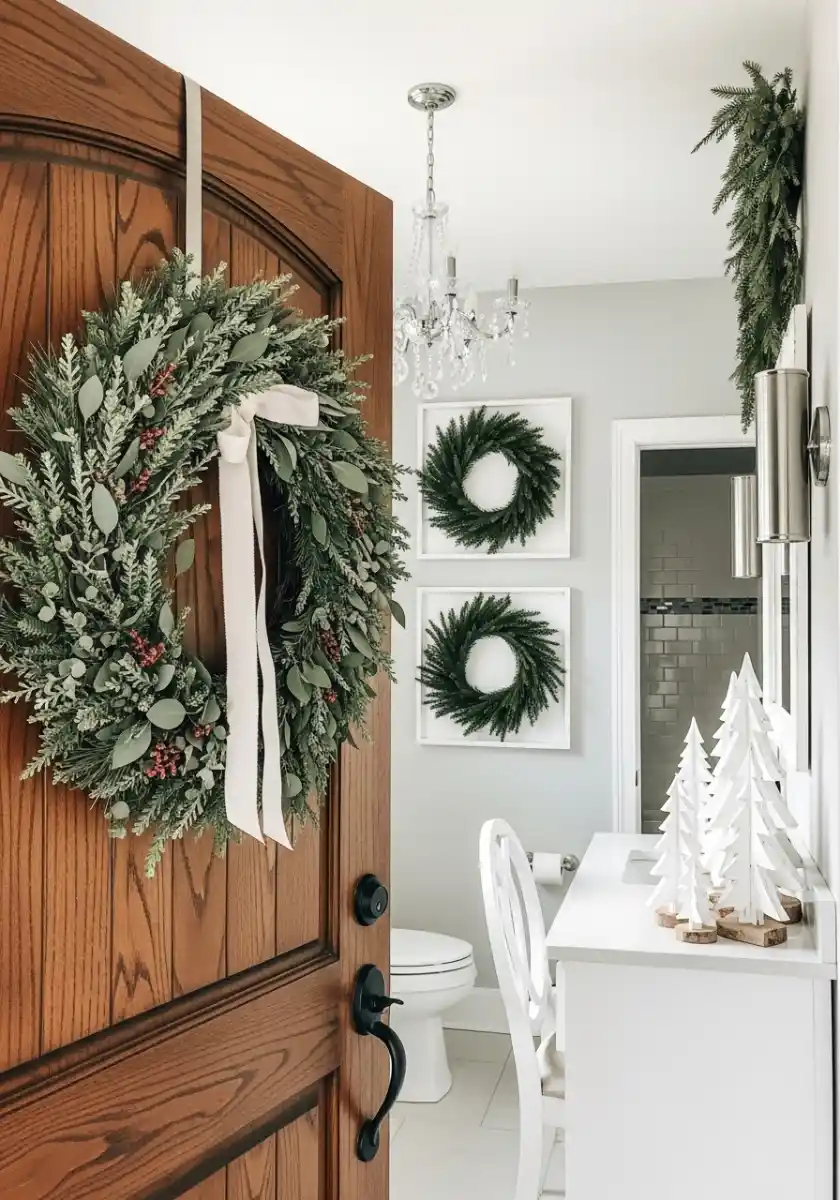 Opening a wood door to a big, lush wreath is already a moment, but this bathroom doubles down with framed wreaths on the far wall and a crystal chandelier twinkling above. The counter hosts carved white trees on rough wood slices. It’s a museum-calm take on Christmas white bathroom decor that still feels joyful. Gray walls, chrome sconces, and bright trim let every green detail pop.