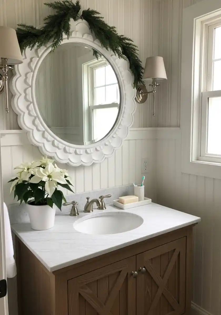 If you can’t find a scalloped mirror, add scalloped trim to a plain frame or use adhesive wood appliques. Keep soap, toothbrush holder, and dish in white ceramics so the plant and garland do the talking. Personal opinion: skip red here. A single sage or oatmeal towel is enough. This is winter white bathroom decor done calm and grown up.