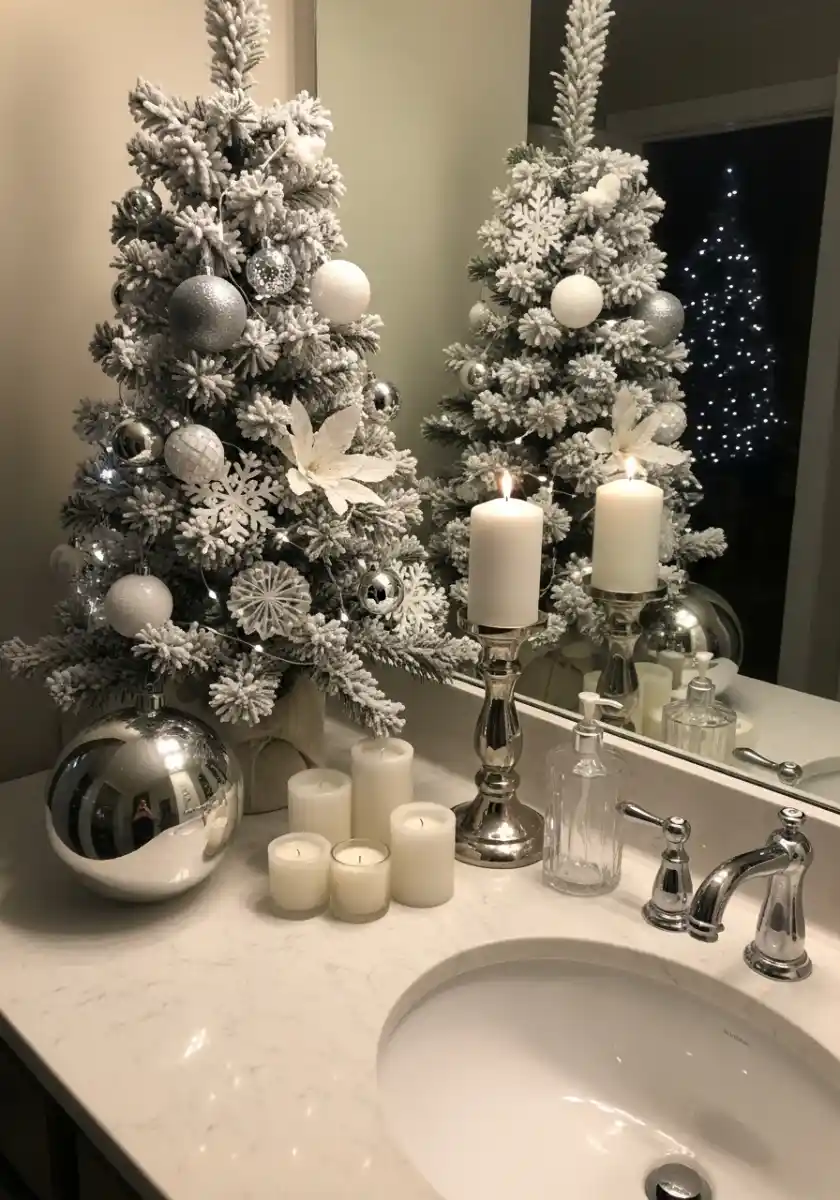 Here’s the drama move for renters. A tabletop flocked tree with silvery ornaments sits beside a cluster of white pillars and a chrome faucet. Everything reflects off the mirror, so it looks twice as full without crowding the sink. It’s classic white Christmas bathroom decorations with a tiny glam moment.