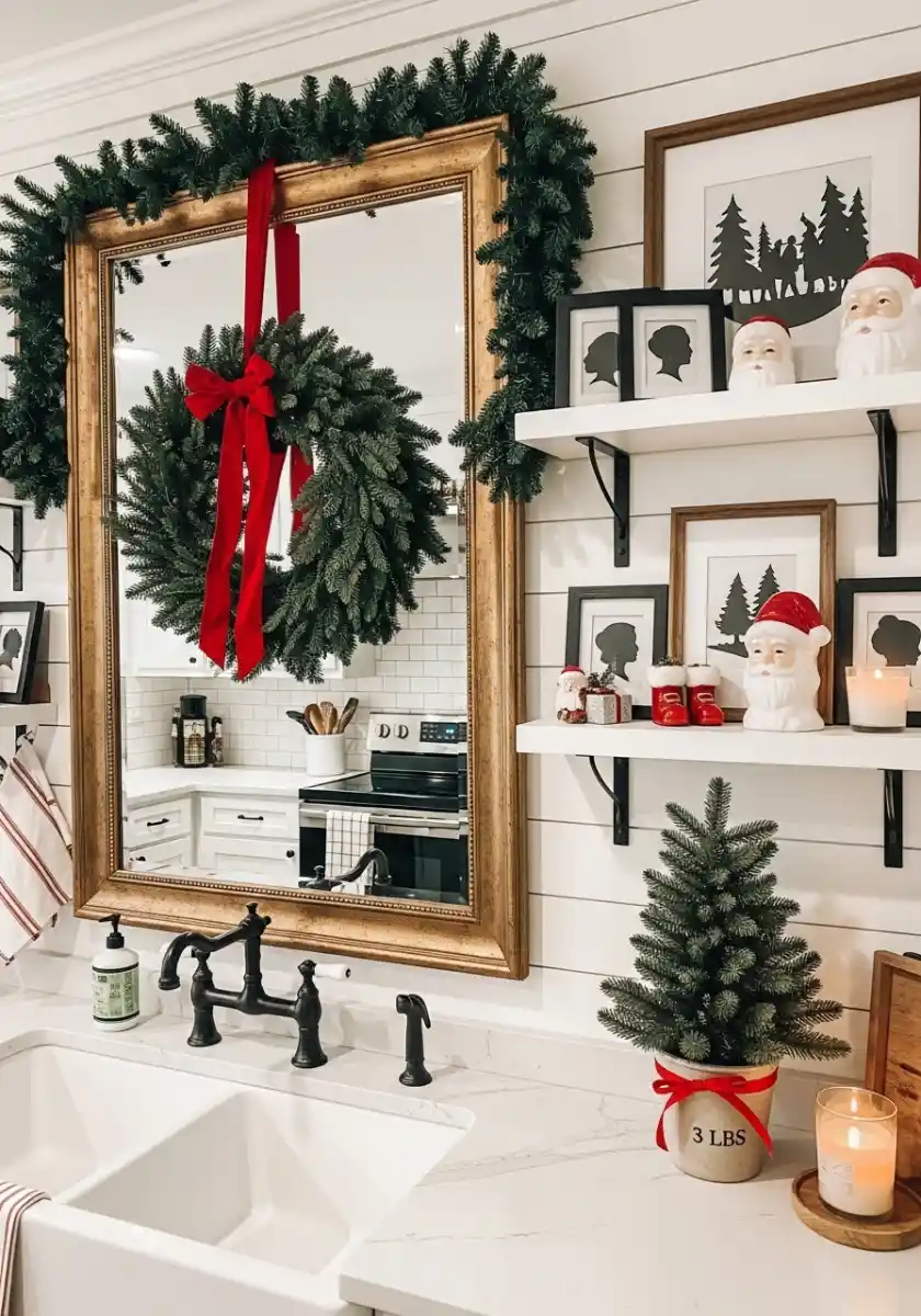 The large gold mirror framed by green garland is so grand, and then a wreath hung right on top with a velvet ribbon adds depth. White shelves carry silhouettes, small Santas, and a tiny potted tree with a red bow. Even with the extra details it stays mostly white winter bathroom decor because the background is all bright.