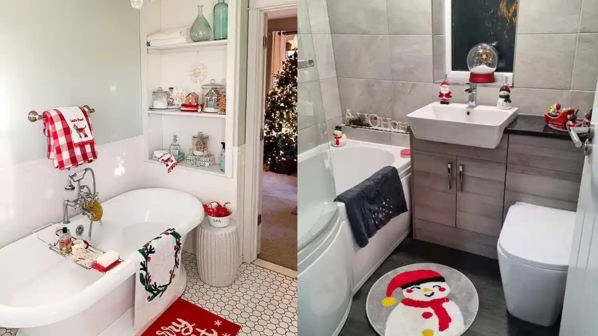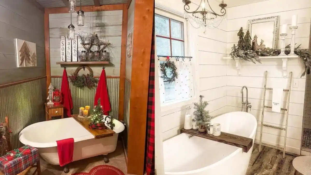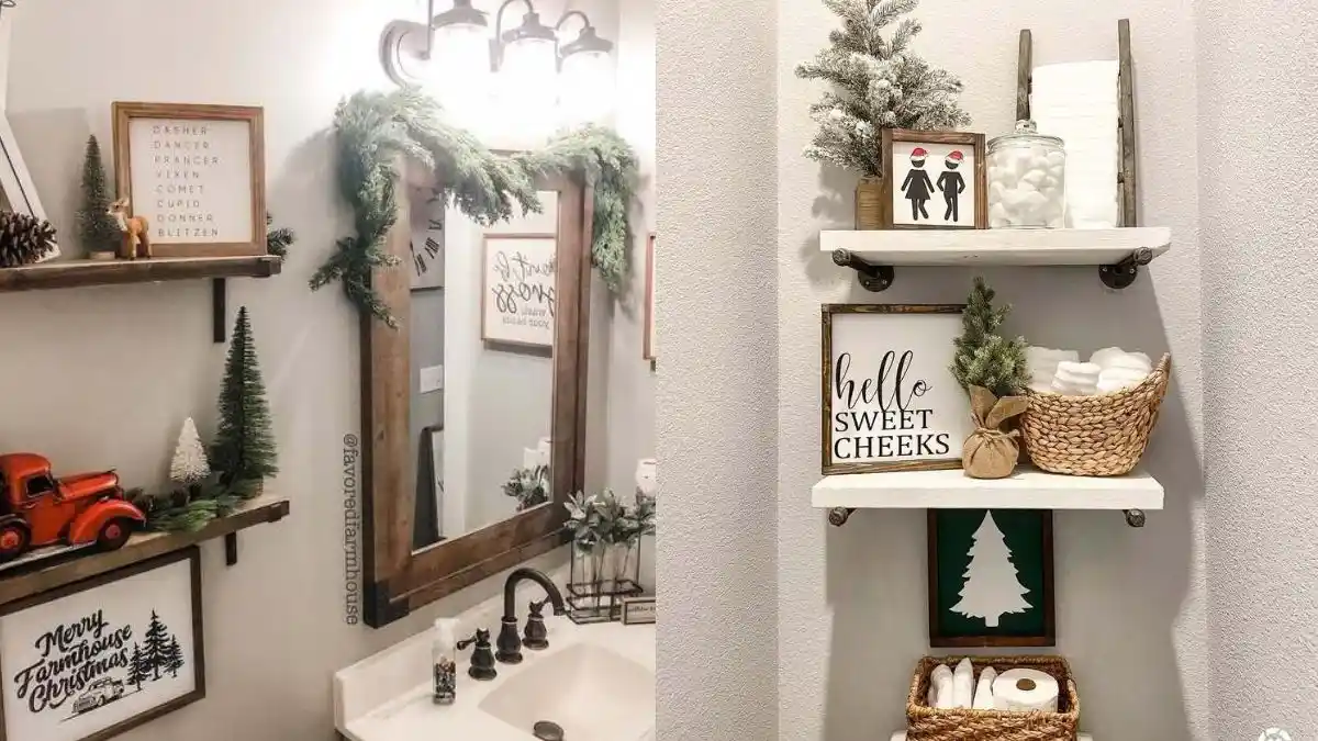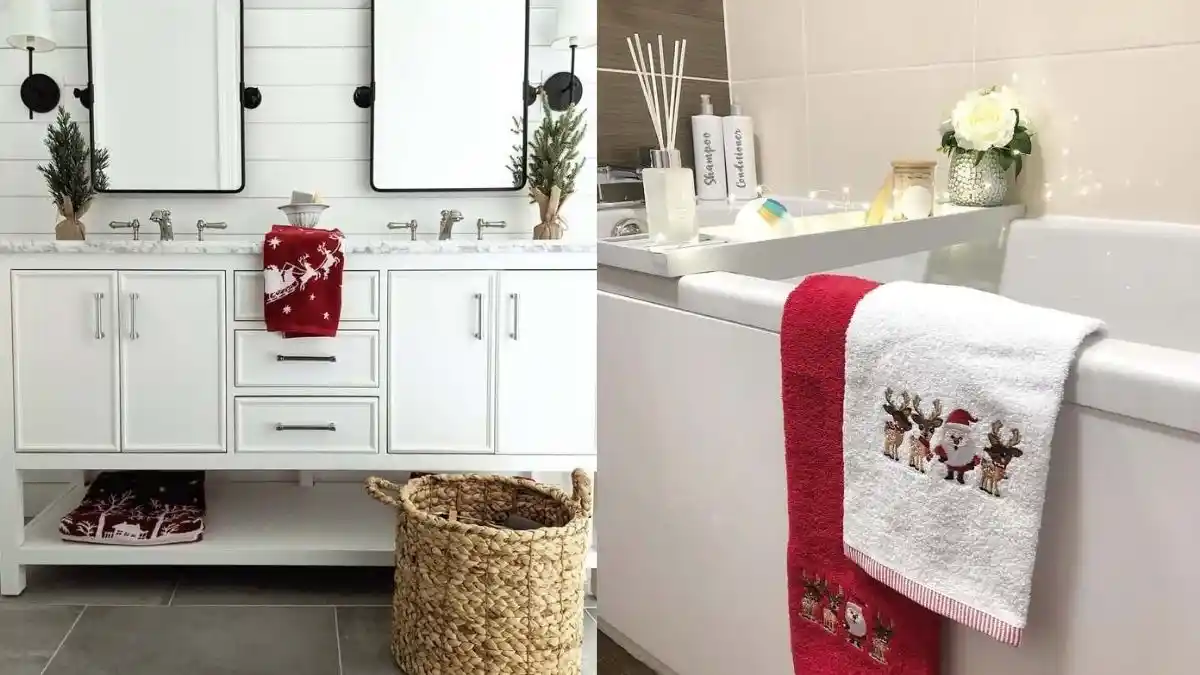 This look swaps bright red for frosty neutrals. A long runner sprinkled with snowflakes leads to the tub. I layered a pale gray towel with snowflakes on the tub rim to match, and kept shelves styled with mint bottles and candies. The result is cool and serene, like a hush after new snow. It’s the winter mood for people who don’t love red and green.