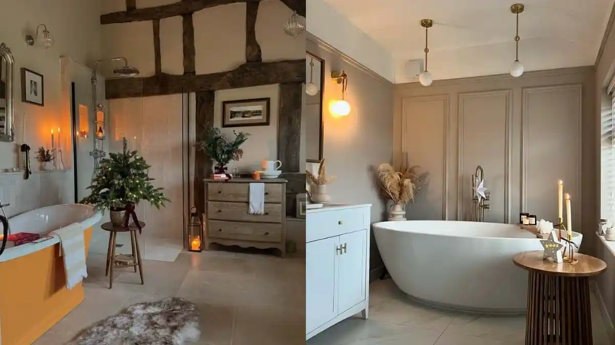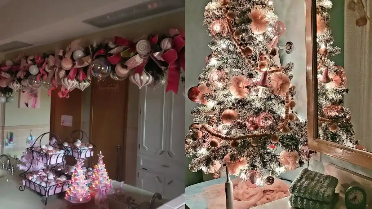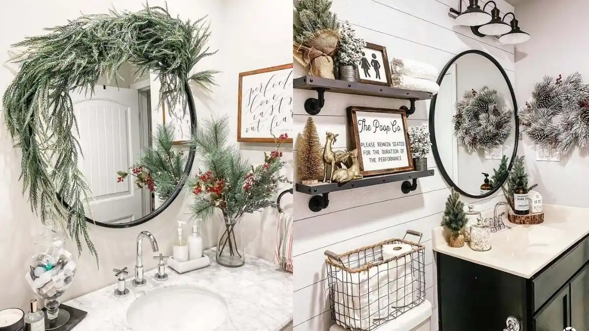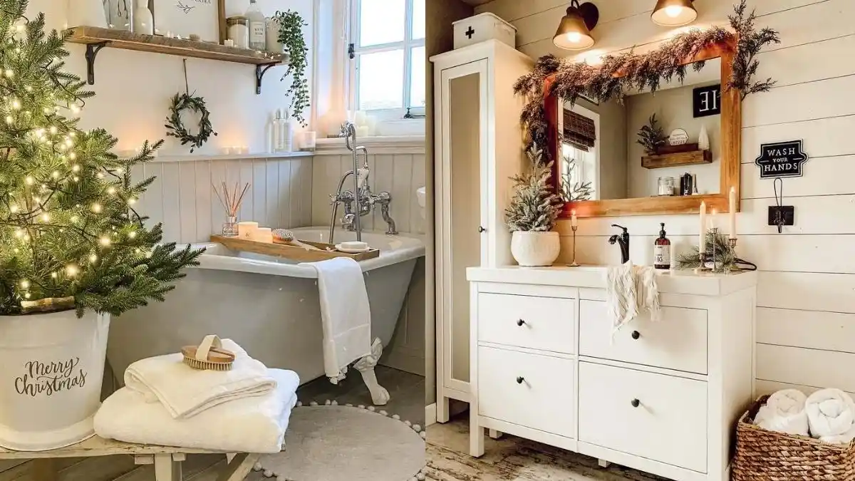 This look swaps bright red for frosty neutrals. A long runner sprinkled with snowflakes leads to the tub. I layered a pale gray towel with snowflakes on the tub rim to match, and kept shelves styled with mint bottles and candies. The result is cool and serene, like a hush after new snow. It’s the winter mood for people who don’t love red and green.