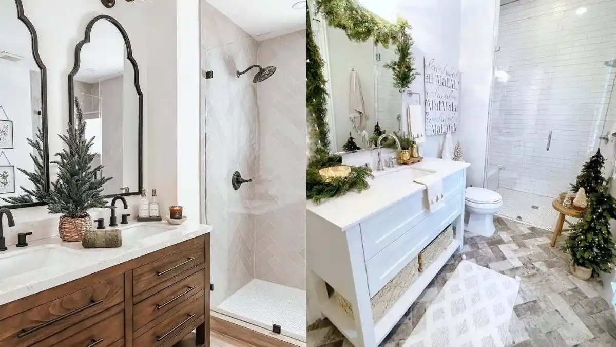Function first. On big-format tile like this, runners can skate. I used a full-length non-slip liner trimmed to size, then set the green holiday bath rug on top. It never budges. If you’re worried about lint on dark floors, choose a rug with tighter loops or a cut-pile that doesn’t shed. Candle on the counter, tiny trees for scale, and you’re done. This look proves that Christmas bathroom rugs don’t have to be all red and cute to feel festive. It’s elegant, renter friendly, and easy to swap back to everyday once January rolls in.