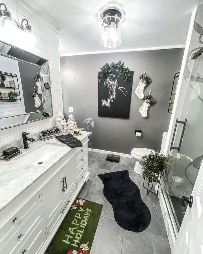 Here we flip the script. Dark walls, white vanity, and a sleek black runner bring a modern, grown-up vibe. The pop of green by the sink is the star of the christmas bathroom rugs show here. The letters are playful, but the overall palette stays calm. I added three white stockings on the wall, plus a small wreath over the art, so the room whispers holiday instead of shouting. The glass chair and chrome mirror bounce light around, which keeps the charcoal paint from feeling heavy.