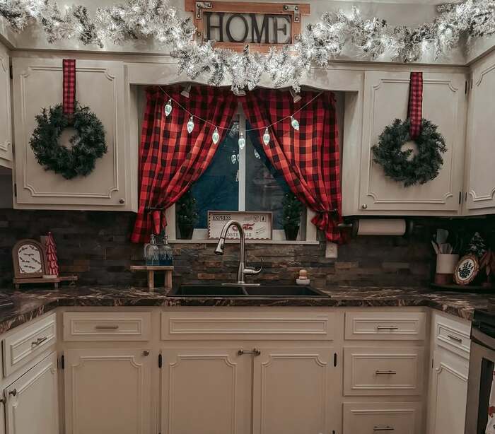 The cozy window scene has red buffalo plaid curtains, frosted garland across the top, and matching wreaths hanging from the cabinets with plaid ribbon. It’s cabin Christmas in the best way. The pattern keeps the space lively even at night. Bows on cupboards are wider here and sit high near the rails so they don’t bump into faucet duty.