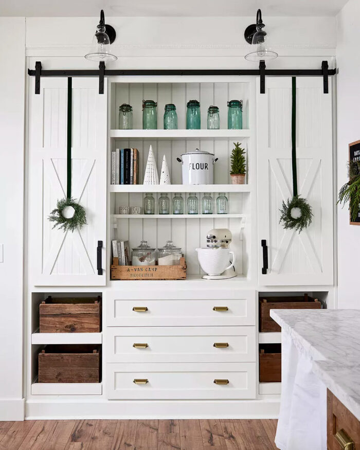 Farmhouse built-ins with sliding doors and emerald ribbon