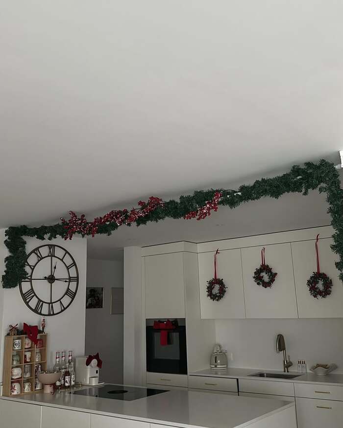 This kitchen is crisp and modern, but the long garland racing the ceiling adds drama. I centered three wreaths on the uppers and tied them with red satin. Yep, christmas bows on kitchen cabinets again, but brighter. Because the room is so clean, I kept the rest quiet. One bow on the oven handle, tiny accents on the counter, done. The result feels cheerful and kind of grown up at the same time.