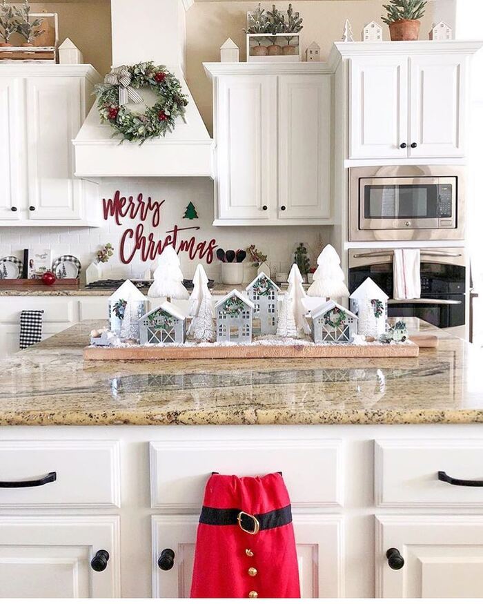 This white kitchen is adorable with a mini village on a long board. The cabinets are simple, so the magic comes from a sweet wreath on the hood and tiny pops of red. If your cabinets feel busy already, keep the bows on cupboards small and neat. Tie short loops at the corner of a few doors or on the knobs. It reads like jewelry. Not loud, just charming.