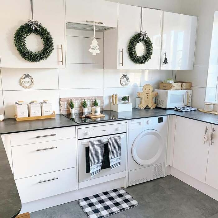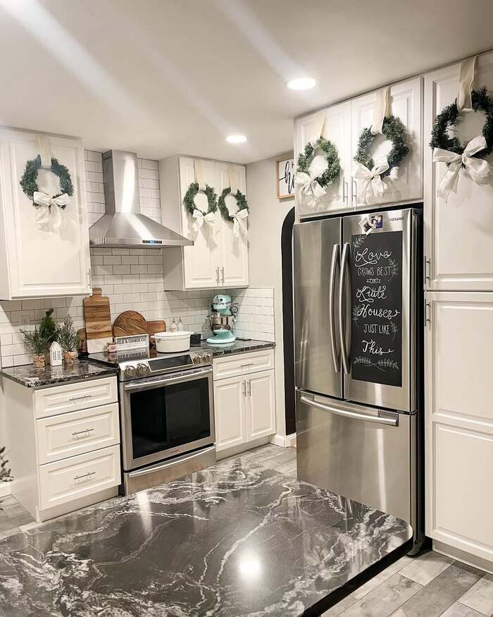 Minimal white kitchen with ceiling garland and trio wreaths