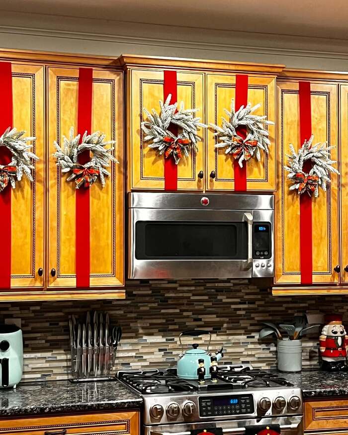 Steps. Measure the same drop for each wreath so lines match. Anchor ribbon inside the doors with removable hooks, then fluff the bows on cabinets after you close them. If your ceiling has a corner, bend the garland there and add berries so the curve looks intentional. Repeat the red with a kettle or towel and call it a day. More phrases you might like when pinning. Bows on kitchen cupboards, kitchen cabinet ribbon, ribbon bows on cabinets, red ribbon cabinet bows, and bows on pantry doors. All cousins of the main idea.
