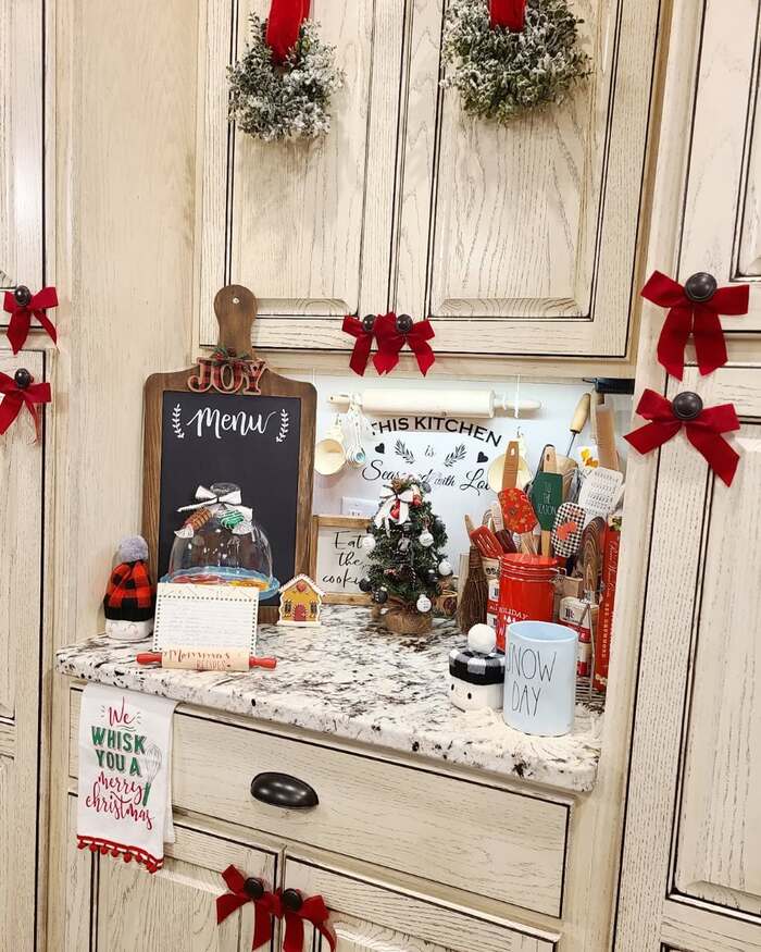 christmas bows on kitchen cabinets