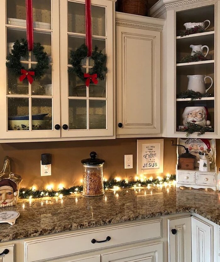 Traditional kitchens love this move. Two glass front cabinets get wreaths tied with dotted red ribbon. Then a strand of warm twinkle lights runs along the counter behind a dusting of faux cedar. It feels like a coffee shop that also has Grandma’s cookies. The cabinet door bows mark the verticals, and the lights pull your eye sideways, so you get balance.