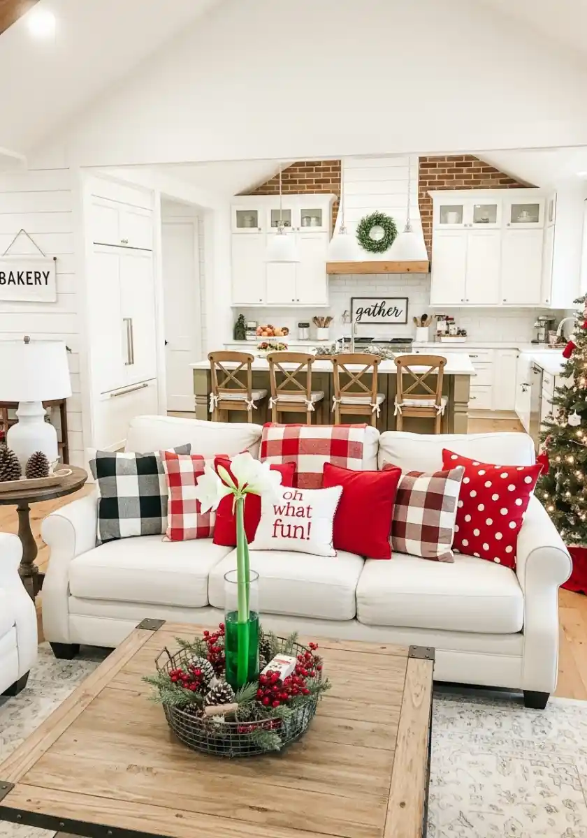 This first look is classic and cheerful. Think white sofa, a chorus of red pillows, buffalo check, polka dots, and a punchy seasonal quote cushion. The kitchen peeks in the background, so the couch has to pull double duty as a focal point. My tip is to build a grid of pattern. Put checks on the left, a text pillow in the middle, and dots on the right. The balance feels intentional and keeps the room from screaming. Add a simple wreath across the room to repeat the green.