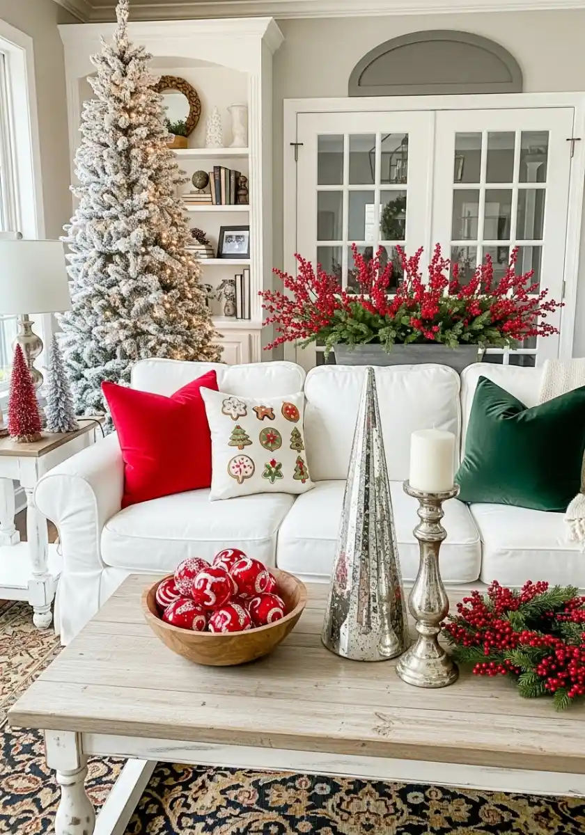 If you like a softer palette, try a frosty tree with cranberry stems and a white sofa. Here the star move is mixing a red pillow with a green velvet one, then sneaking in a whimsical cookie pillow for a wink. I admit I thought the cookie print might look too kiddie, but it gives personality. Use mercury glass cones on the table to bring shine without glitter mess. This variation sits high on my list of holiday couch decor ideas because it layers texture more than color.