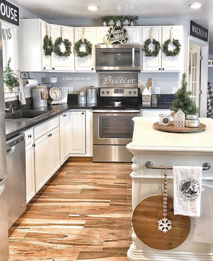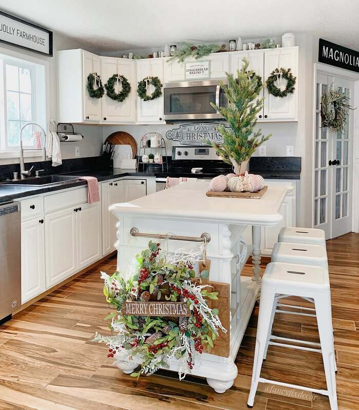 This kitchen layers textures so well. You get wreaths on the doors, galvanized tins up top, and a silver “Merry Christmas” message near the microwave. The trick to christmas decor above kitchen cabinets here is color control. Keep it green, white, and metal. Nothing too loud. The wood floors bring warmth and stop it from feeling cold.