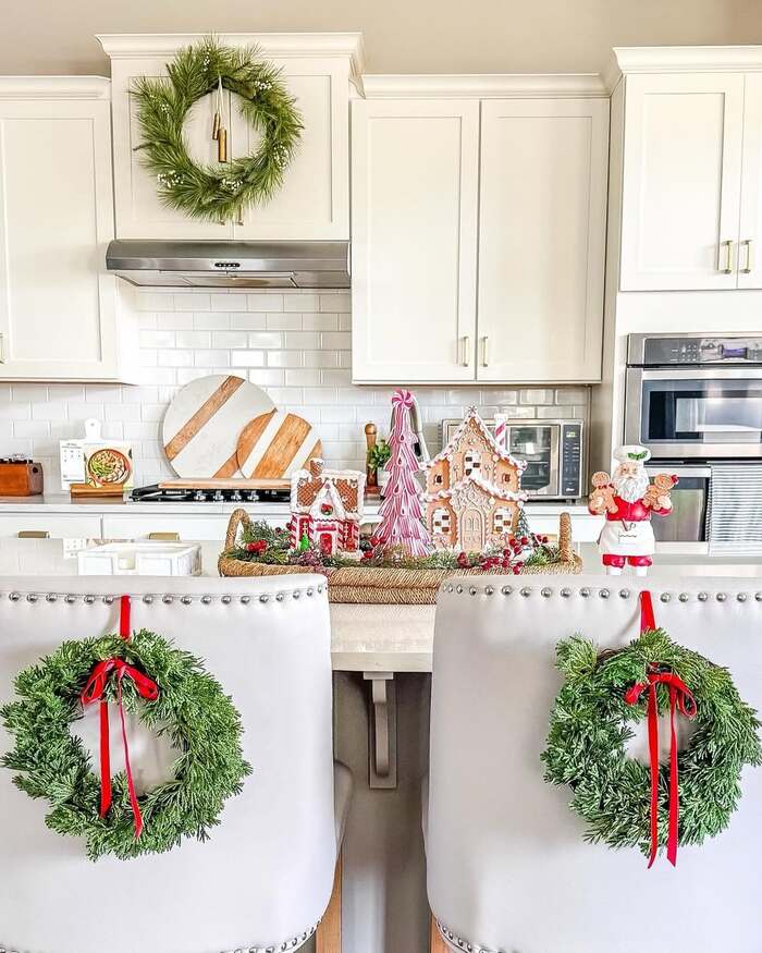 Copy this by choosing one texture for the top decoration. Try cedar for garland above kitchen cabinets and pair it with brass bells or wood beads. Keep the colors quiet near the ceiling and louder at eye level. I like how the back of the island has small wreaths tied to chairs, which repeats the circle shape from above. It reads polished. Add a cutting board with stripes to break up all the white and your Christmas kitchen decorations feel layered, not flat.