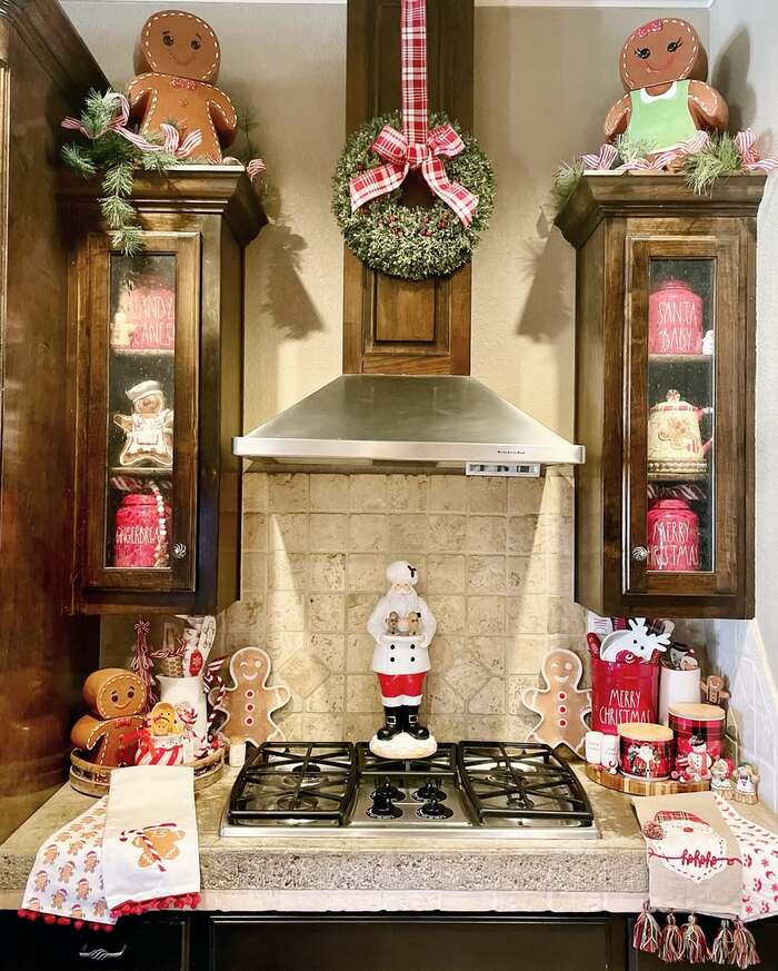 Warm wood plus gingham ribbon makes me nostalgic. Two big gingerbread figures sit on the side cabinets with sprigs of pine. A plaid bow hangs in the center. If you want Christmas decor on top of cabinets that stands out against dark stain, pick brighter pieces with matte finishes. The contrast is cozy and fun.