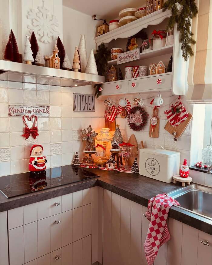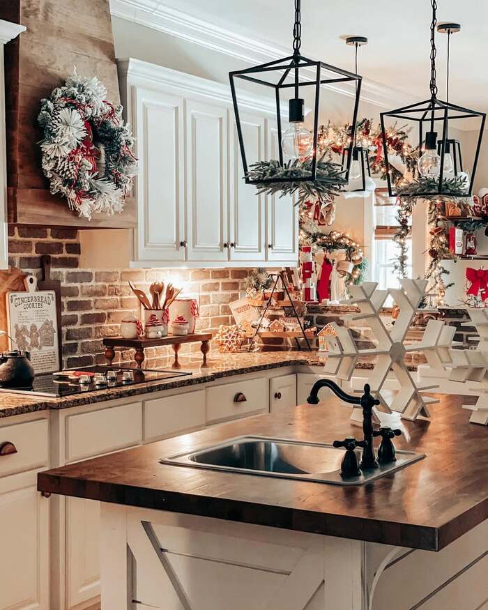 My favorite for mood. The warm brick and wood countertop feel like a cabin at 5 pm when snow starts. The wreath on the hood is chunky and frosty, and the top shelves carry gingerbread houses in a little staggered village. For christmas decor above kitchen cabinets, build height near your hood first, then taper down with smaller pieces like trees and mugs. That shape looks natural, almost like hills.