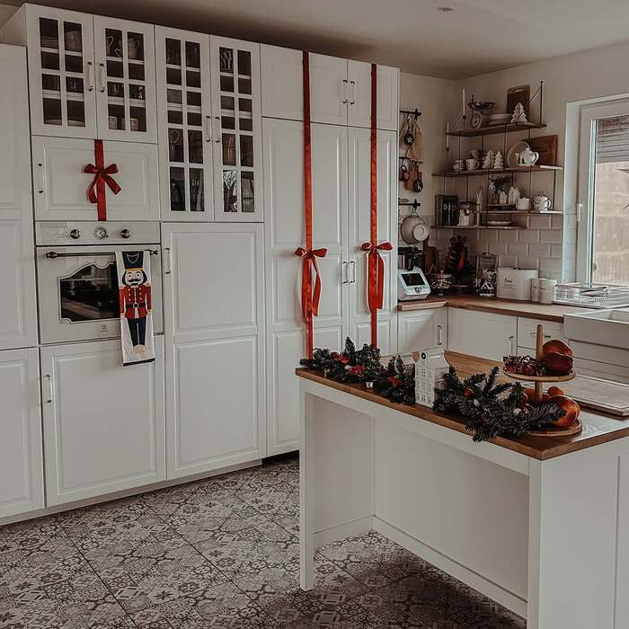 Okay, this one made me gasp. The tall cabinets are wrapped like presents with long red ribbons. It’s easy and it totally reads festive from across the room. For decor above cabinets for Christmas, I’d keep the top ledge minimal. Let the vertical ribbons be the drama and then place one short evergreen runner on the island to balance the height. The nutcracker towel adds personality. I’m pro little touches that feel silly and fun.