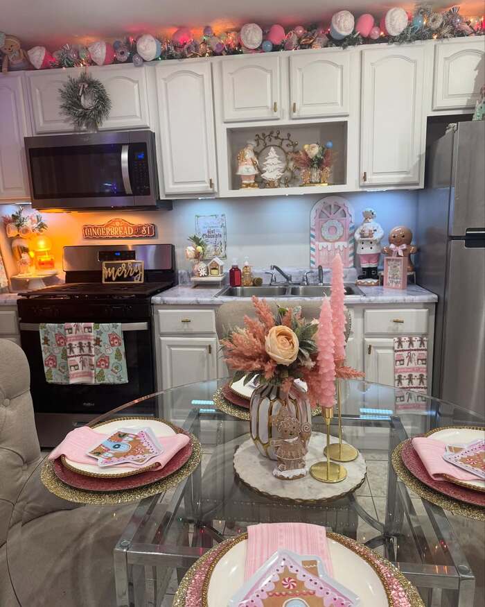 For Christmas cabinet garland in pastels, grab frosted greenery and tuck in matte ornaments instead of shiny ones. They look more grown up. Use a single wreath on the cabinet center to ground the sugary bits. Bring the theme onto the table with pink napkins and gingerbread plates so the top decor doesn’t feel random. If you’re on a budget, spray paint old ornaments blush and mix them with thrift store candlesticks. Boom, custom Christmas kitchen decorations that feel boutique.