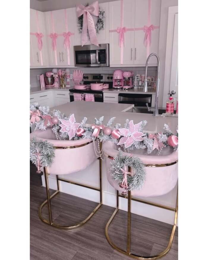 This pastel kitchen wraps the cabinet doors like presents. The bows are soft baby pink, with one oversized bow above the microwave stealing the scene. For christmas decor above kitchen cabinets, the key is repeating vertical ribbon so your eye goes up. It makes even short ceilings feel taller. I like pairing frosted garland on the island with matching mini wreaths tied to the barstools so the theme lands in more than one spot.