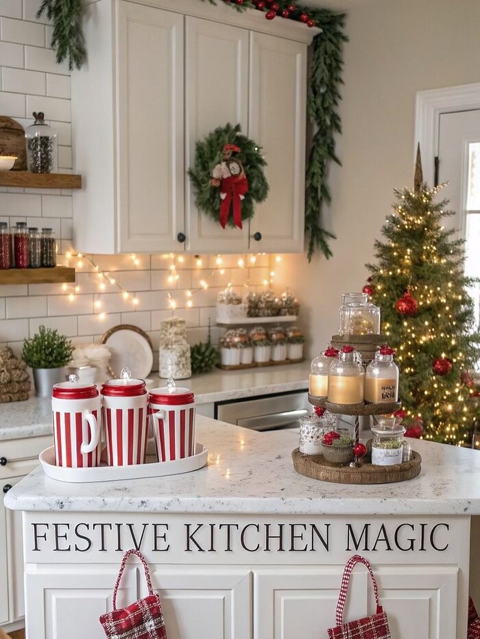 I’m a sucker for open shelves at Christmas because they behave like tiny stages. Mini houses, star trees, peppermint signs, and a snowy swag sitting on the very top shelf. For holiday kitchen cabinet garland, go narrow and slightly frosted so it doesn’t shed into your dishes. Repeat candy cane stripes in towels and mugs to make the color story strong.