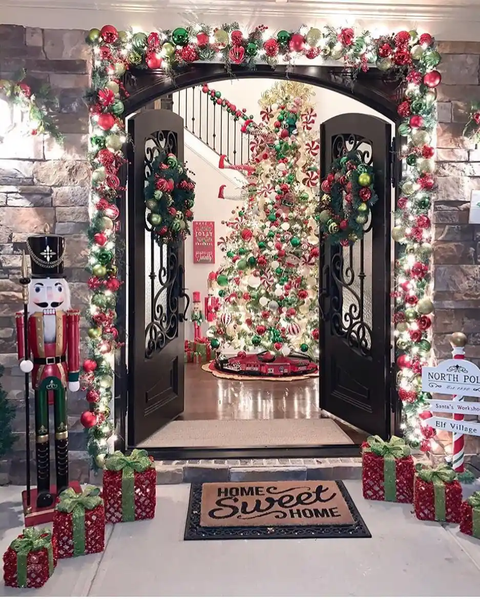 The doorway is wrapped in an arched garland stuffed with red, green, and gold ornaments like a peppermint frame. Matching wreaths on iron doors and a life-size nutcracker finish the look. From outside, you can see a candy-loaded tree inside, which teases guests and kids.