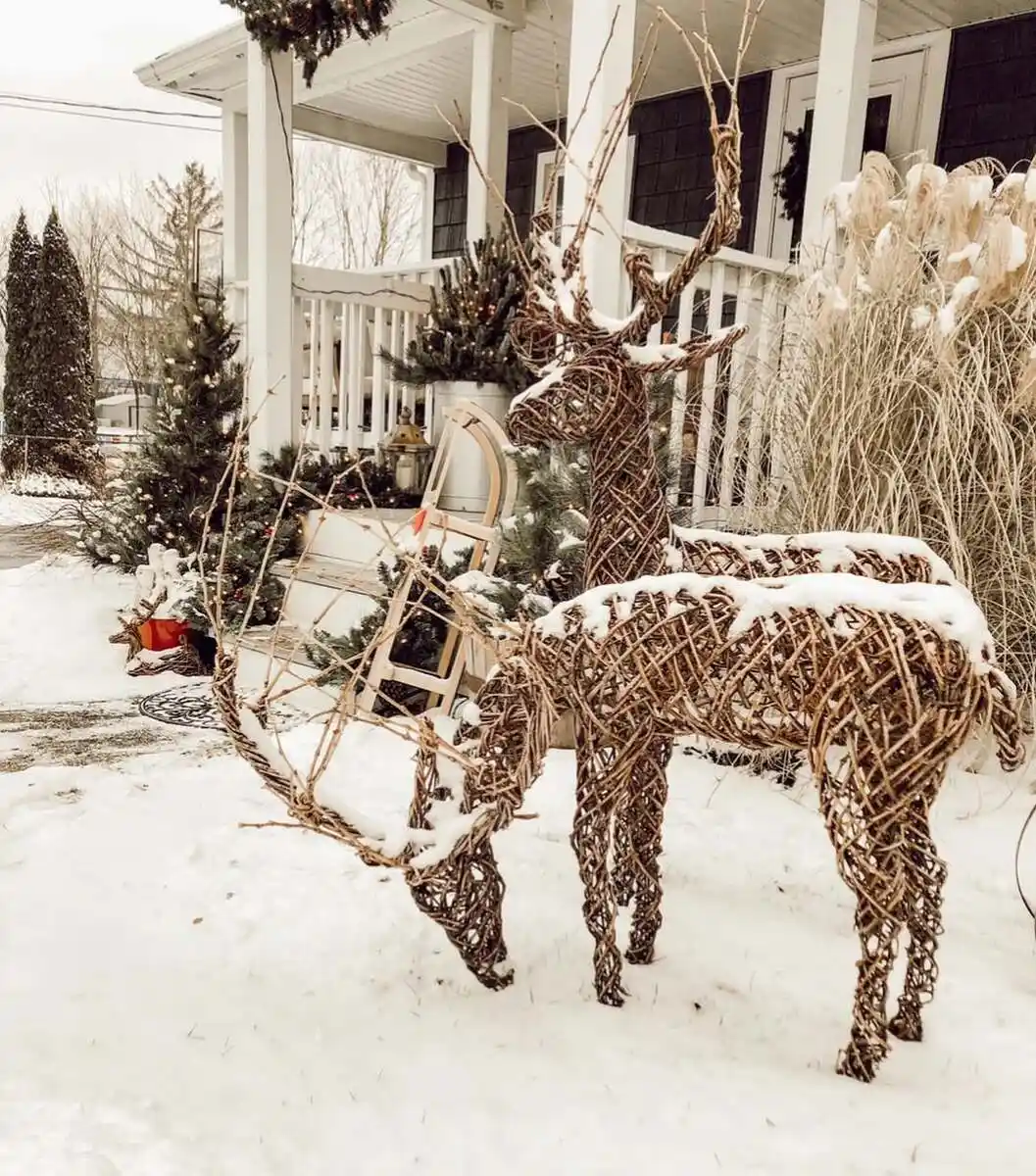 If you don’t get natural snow, spray the reindeer lightly with flocking for a frosty edge. Wrap a narrow micro-light strand around the antlers so they glimmer at night. This is quiet, textural outdoor holiday decor that lets nature be the hero.
