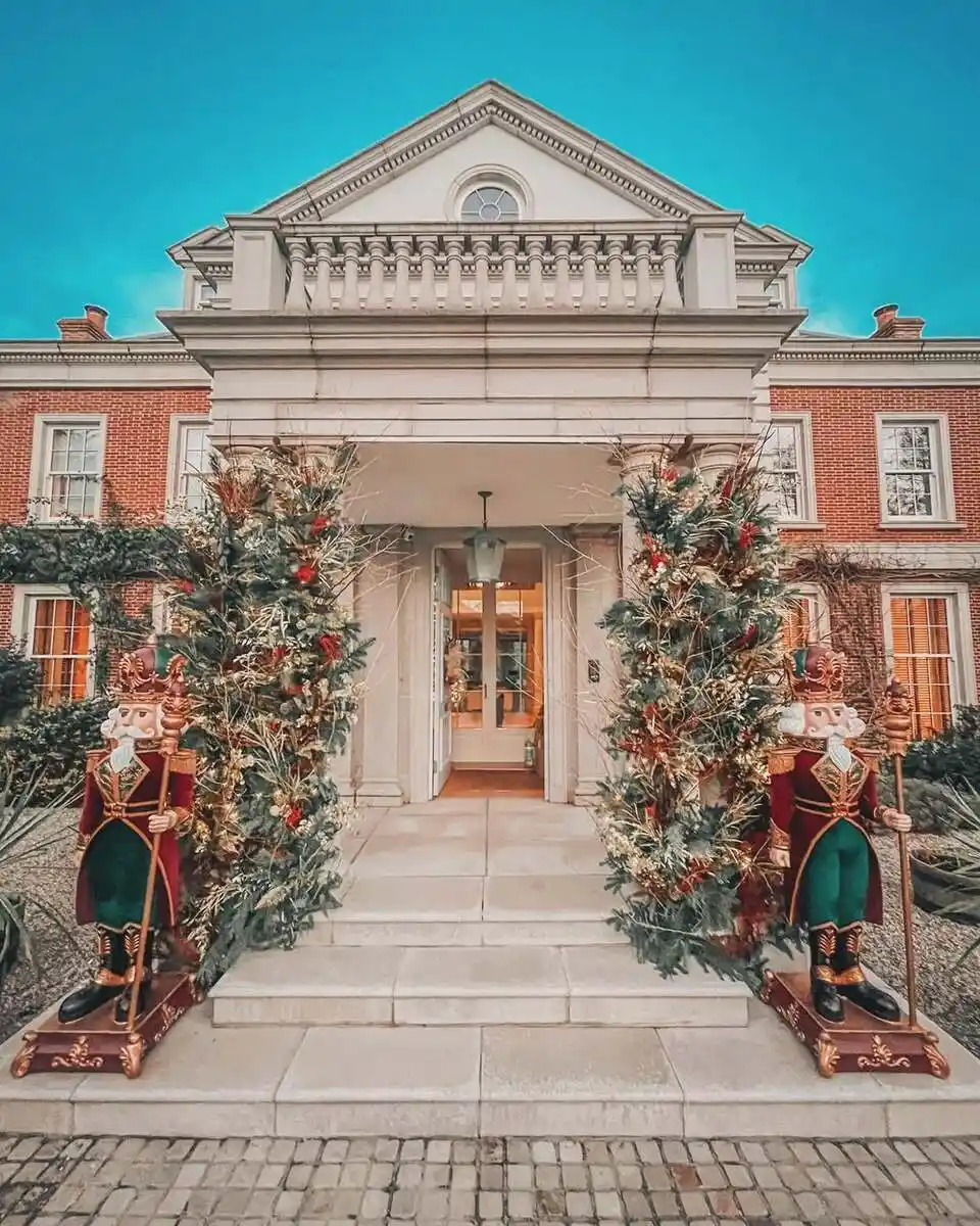 Two life-size nutcrackers standing guard by tall ornamented trees turns your front door into a picture-book scene. Lush greens, gold accents, and warm lighting around the doorway frame the display so it doesn’t get lost against big architecture. If your house has a grand entry, go tall or it will look skimpy.