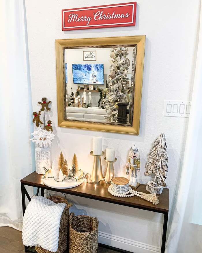 The last idea feels like a hug. A wood console with baskets below, a gold framed mirror, and a simple red Merry Christmas sign up top. On the table there’s a vignette of gold cone trees, a nutcracker, candles, a beaded garland, and a white tray full of mini trees wrapped in lights. The baskets hold blankets for movie nights. It’s friendly and a bit glam.