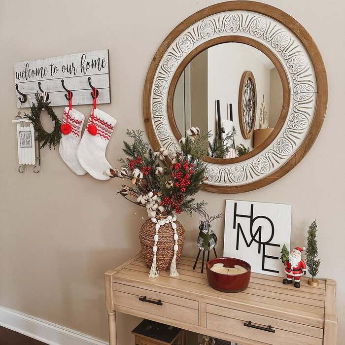 To copy it, start with one big vase that has texture. Rope, rattan, or knitted covers work. Build a bouquet using one tall stem, one fluffy stem, and one pop of red. Set a candle bowl for scent and a low figure like Santa to make it playful. Balance the height by leaning a thin sign or framed art on the opposite side. Hooks above the table do double duty. They hold stockings during December and dog leashes the rest of the year. That’s smart holiday entry table decor you won’t regret buying.
