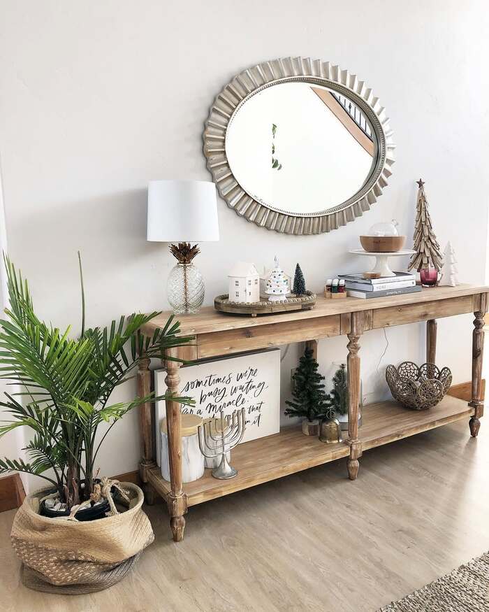 For festive entry table decor with this Scandi vibe, choose a pale wood and limit yourself to five objects on top. Odd number groupings keep it lively. Touchable materials help, like unfinished wood, paper trees, and soft knit throws. If you want more height, pop a tiny olive tree in a pot next to the console. Use command hooks under the table lip to hang a short strand of fairy lights. They glow onto the floor and feel like sunshine at night. No drilling, no fuss.