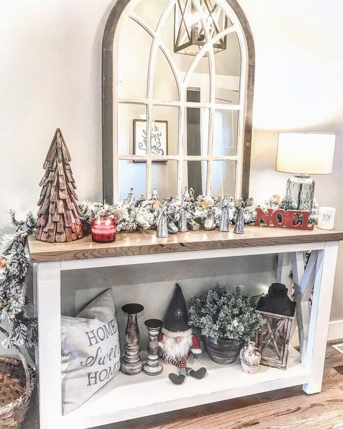 This console pairs a white base with a rustic wood top and a big arched window mirror. A frosted garland stretches across with small mercury glass trees like icicles. A single red candle warms the scene and the word “NOEL” adds a playful pop. Below, a pillow, a gnome, and a lantern make it feel lived in. It’s cottage holiday entryway console decor that still photographs pretty.