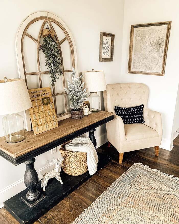 This first idea gives farmhouse calm the second you open the door. A light wood console sits between two warm wood doors, and the arch mirror wears a simple swag of greenery. On the tabletop there’s a framed antler sketch, little ceramic houses, a tiny herd of trees, and a wooden deer. The bottom shelf is practical but cute, with a big basket, a folded throw, and a pillow that hints at red without shouting. The mood is relaxed and honest. Like, yes, we celebrate here but we also need a place to toss mittens.