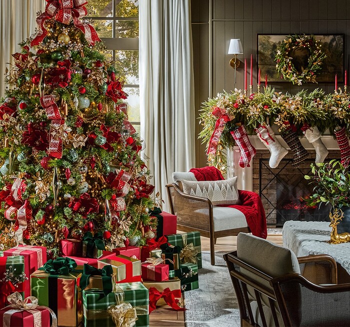This room is holiday movie magic. The tree is thick with red ribbons, greenery picks, and gold stars. Across the room the mantel carries a deep, mixed garland stuffed with berries and cedar, with red tapers marching across the top. I love how the plaid stockings and bows repeat from tree to fireplace so your eyes travel around the space. My confession, I tried only one garland at first and it looked flat. Doubling the greens, then fluffing outward, made it feel like the expensive catalogs.
