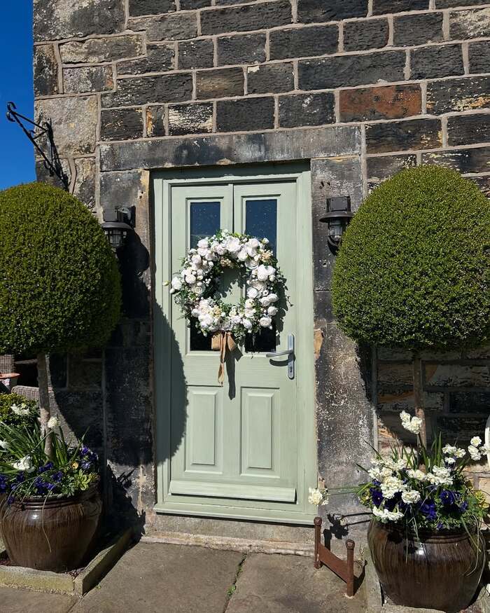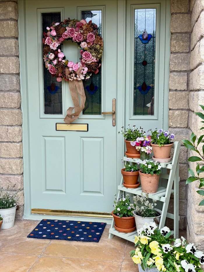 Minimalists, this one’s for you. The minty door holds a fluffy white wreath with green bits, and the surrounding planters stay tidy with white blooms and cool-toned foliage. No giant arch, just clean lines and calm. When my brain is full, this soft welcome actually feels like a nap.