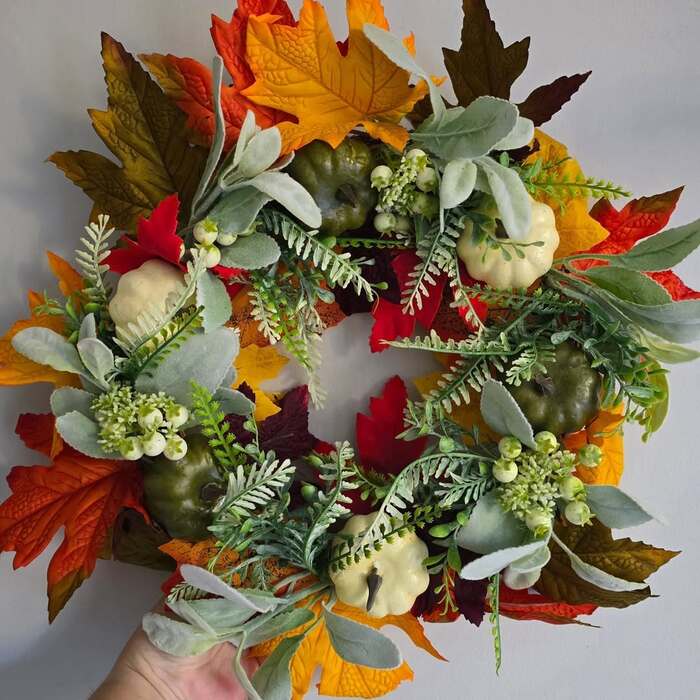 This pumpkin leaf wreath screams October, but it is easy to bridge into December. Keep the leafy tones, then run a skinny evergreen garland along your door or mantel and tuck in clusters of white ornaments, tiny pinecones, and a few cinnamon sticks. The warm colors glow against winter lights. I like how it feels collected, like you grew it from your yard.