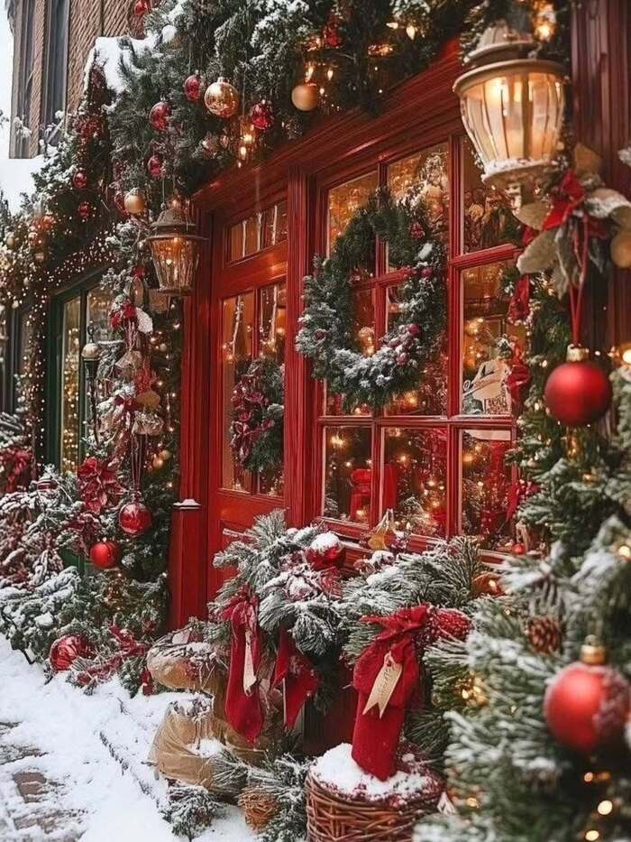Talk about a storybook. The red shop is wrapped in super plush garlands, snow dusted and heavily lit, with big ornaments tucked deep. What sells it is density and layering, not just length. My first try looked thin, like spaghetti. Three layers fixed it, plus the trick of pushing ornaments way inside the greenery so the depth shows.