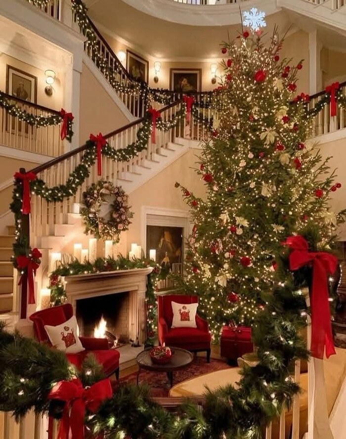 If you’ve got stairs, this is your moment. Garland runs the whole railing, tied at posts with big red bows. Candles glow on the mantel and a wreath hangs over the fire, so the eye keeps circling the room. Stairs are sneaky, though. I once attached greens only to the top rail and they rolled. Tie to the balusters instead, every fourth spindle.