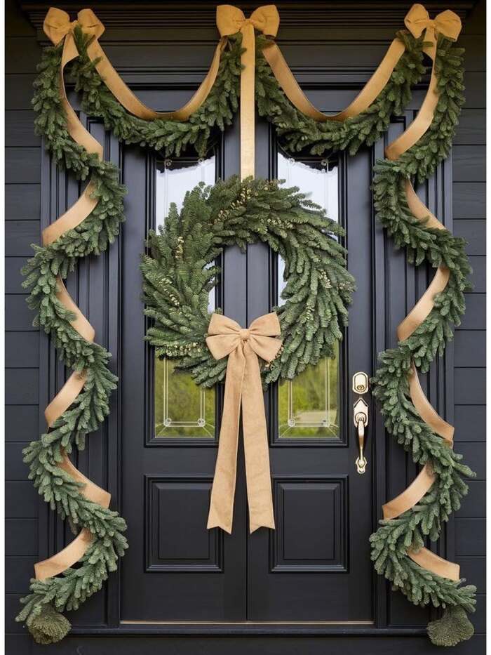 Make the swags for this front door garland idea by building three equal loops and pinning each to a tiny cup hook. Weave ribbon in a soft S pattern and twist it slightly as you go so the edges show. Heavy tassels or pinecone drops anchor the ends, helpful in wind. If you have sidelights, keep decoration slim there so it never blocks glass. This understated setup is a masterclass in Christmas garland inspiration.
