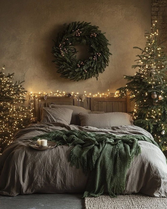 Bedrooms deserve magic too. A soft evergreen garland runs along the headboard with teeny lights, and a big wreath hangs above the bed. The palette stays earth toned, just greens and warm white, which feels peaceful. I tried colored bulbs once in here and it felt like a carnival. Save color for living spaces, keep sleep zones calm.