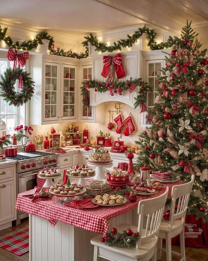 Different kitchen, same cheer. The garland swag runs around the cabinet crown and over the range hood, then big red check bows land at the corners. A matching wreath hangs in the window. I like this because the pattern mixing is disciplined, mostly checks and solids. When I threw polka dots in mine, it went noisy fast.