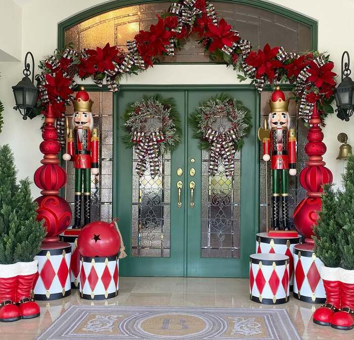 The front entry is basically a parade. A giant arch of greenery with oversized bows frames emerald doors, and two towering nutcrackers guard each side like cheerful bouncers. Matching wreaths hang on the glass, stuffed with striped ribbon and frosty picks. It’s bold and honestly kind of magical. I’m a fan because guests smile before they even knock.